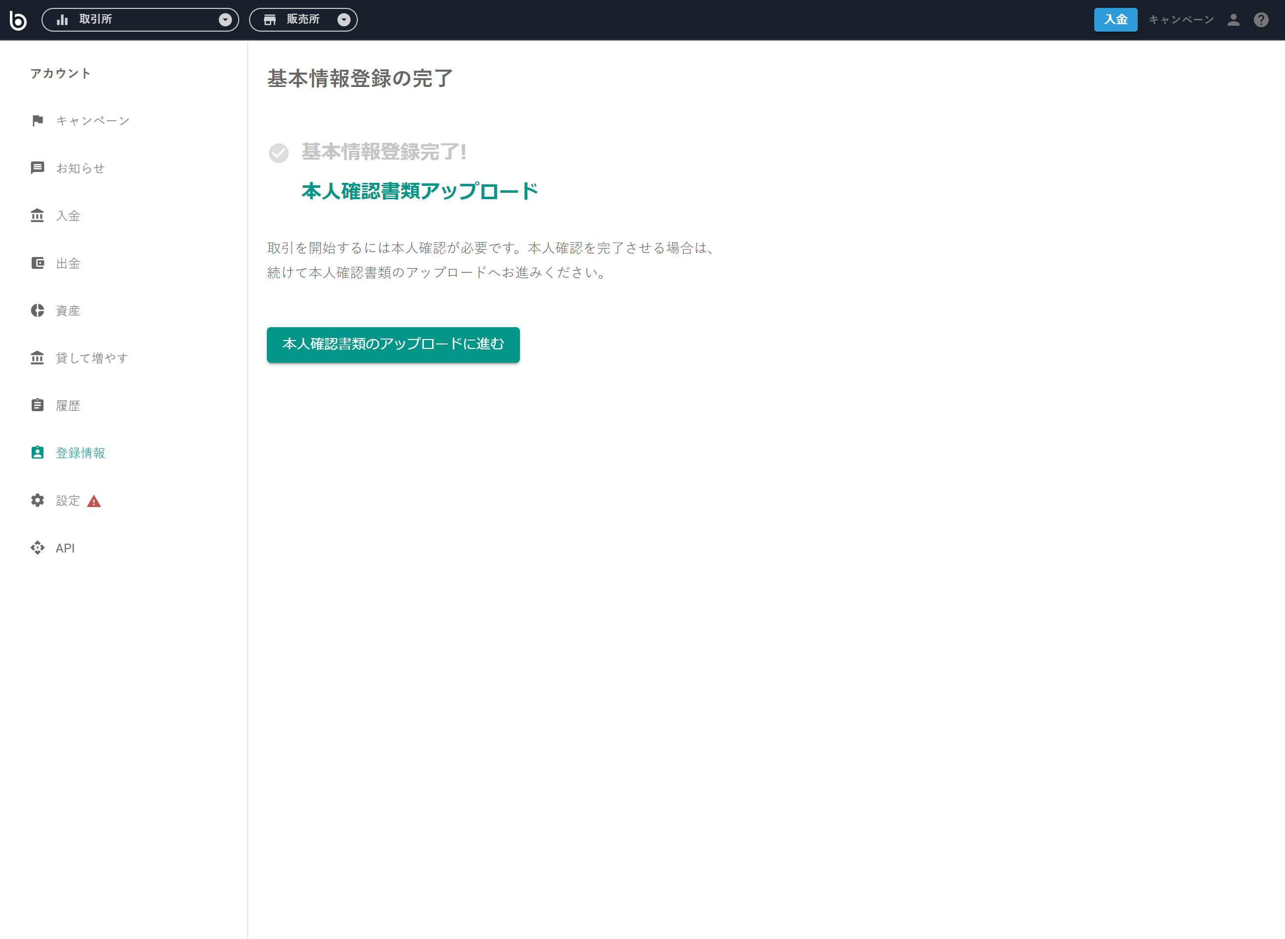 ・基本情報の登録完了 ・「本人確認資料のアップロードに進む」を選択して本人確認へ |